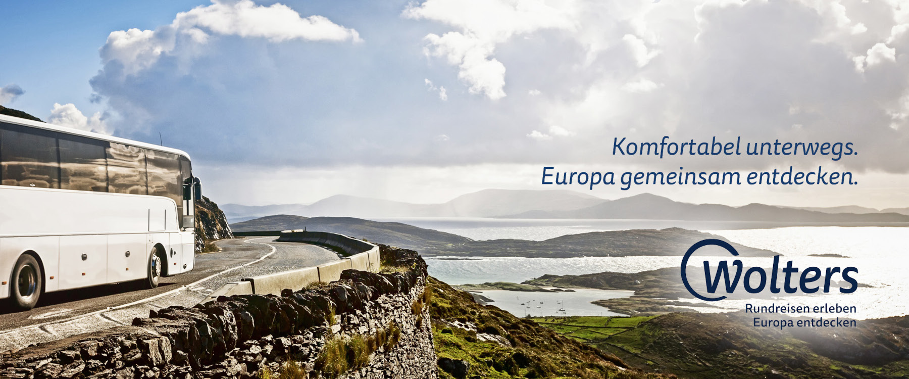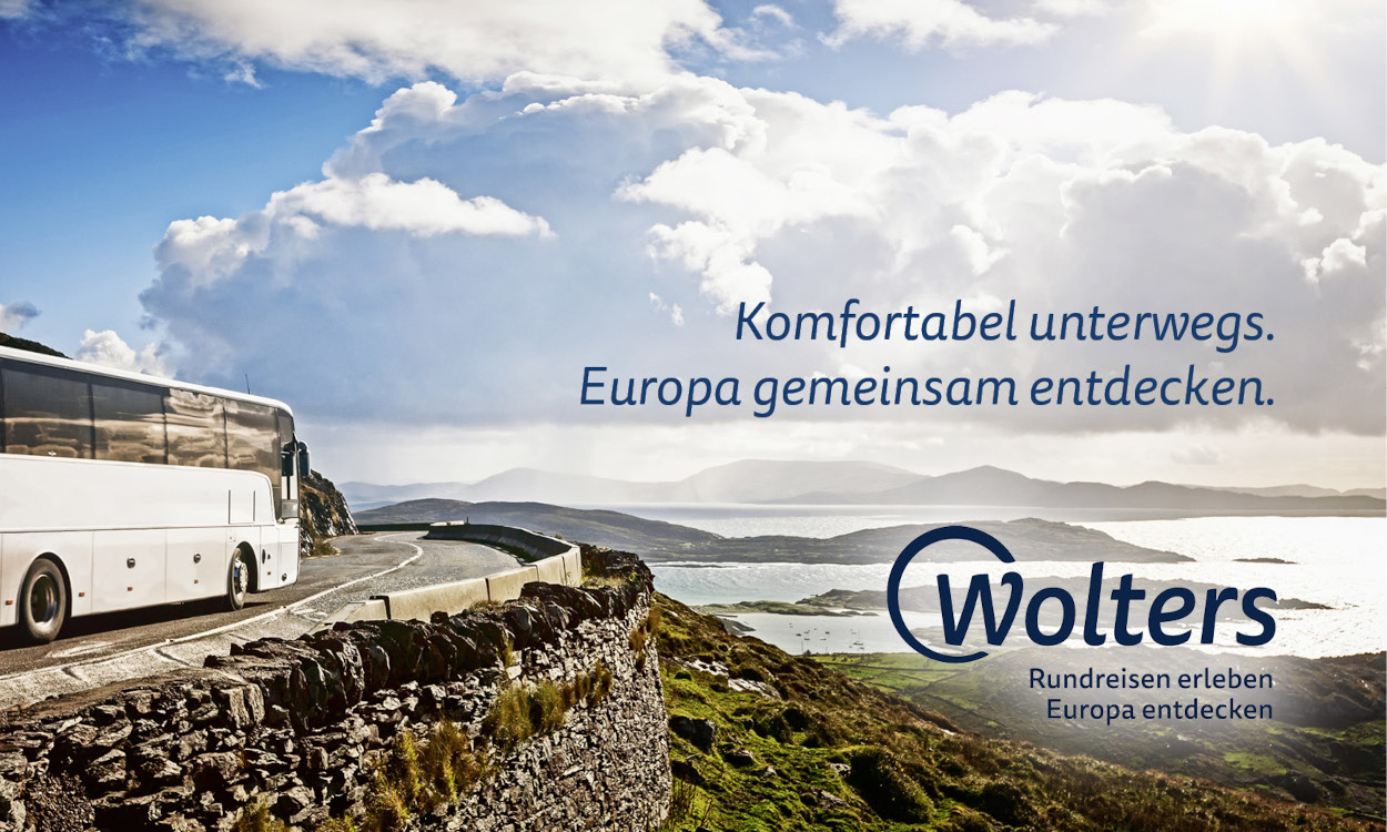 Ein rotes Auto fährt auf einer Straße durch eine weite Berglandschaft bei Sonnenuntergang. Text: „Neu bei Wolters Rundreisen: Anpassbare Autoreisen“.