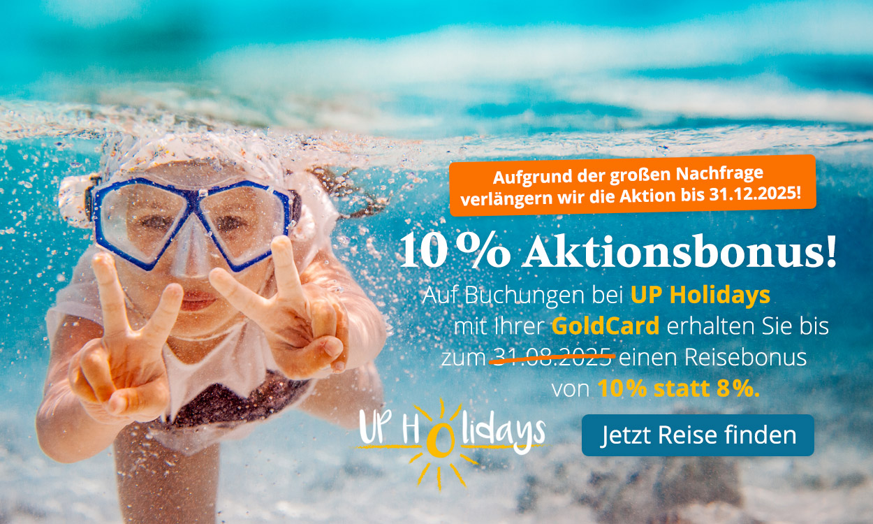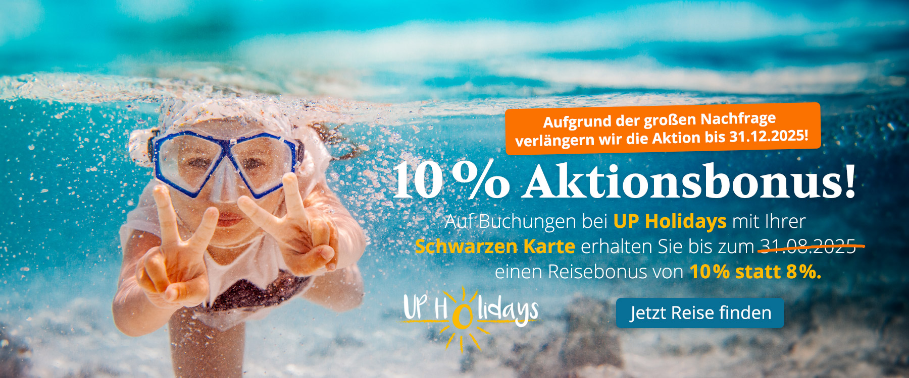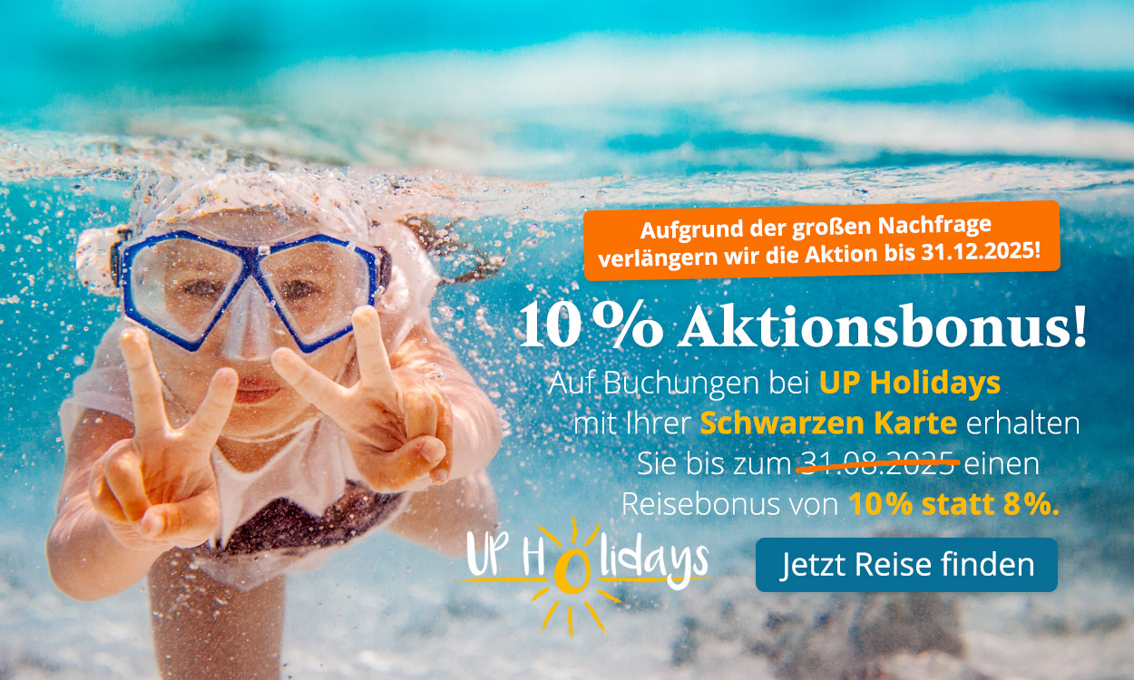 Sonnenuntergang über Santorini mit den ikonischen weißen Häusern und blauen Kuppelkirchen, bewirbt 7% Bonus auf Reisen bei UP Holidays.