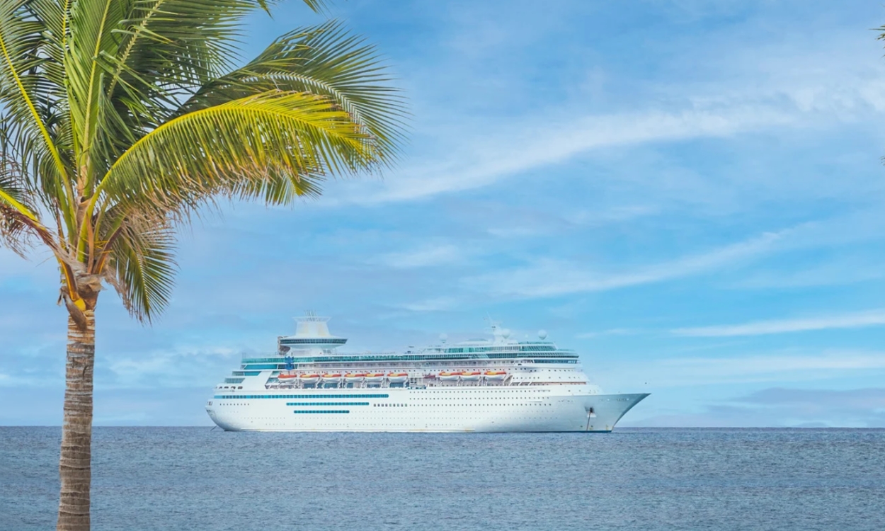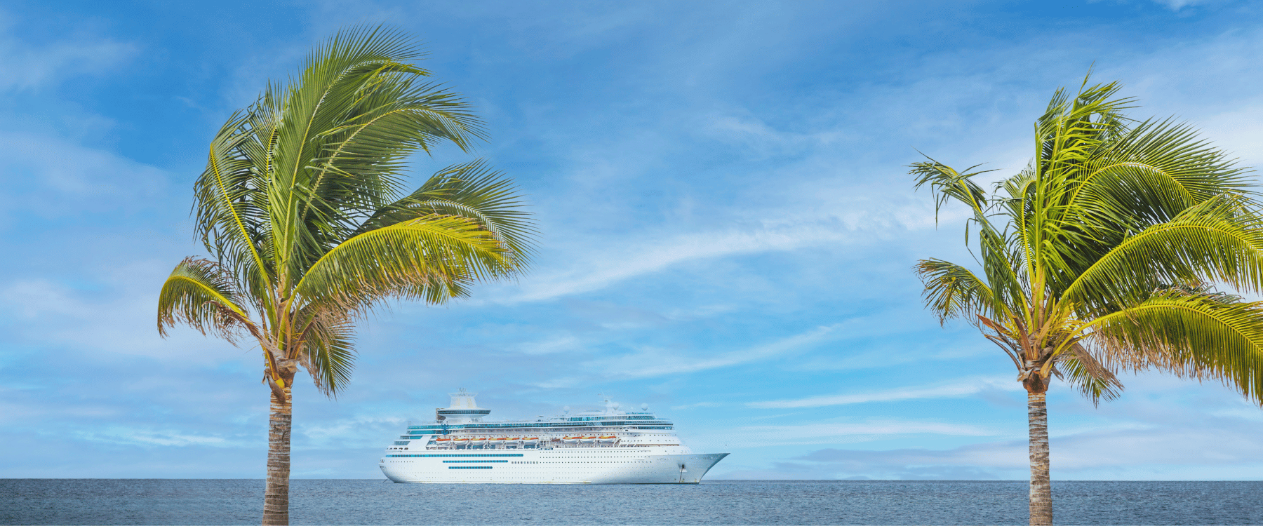 Blick über die Reling eines Kreuzfahrtschiffs auf das offene Meer. Die Kielspur des Schiffs zieht sich in die weite, blaue Ferne.
